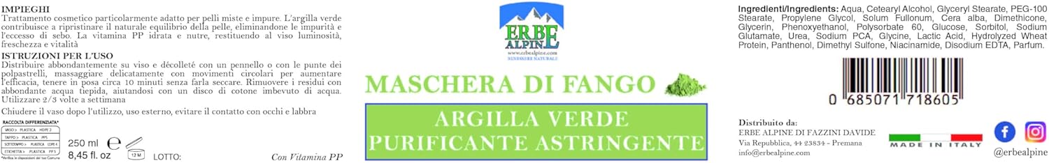 L'Argilla Verde (Illite/Montmorillonite) assorbe efficacemente l'eccesso di sebo, le impurità e le tossine, liberando i pori e svolgendo un'azione astringente e riequilibrante fondamentale per la pelle grassa e mista.